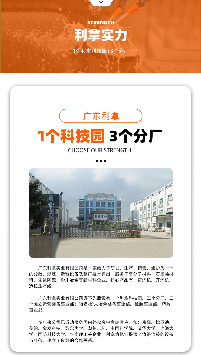 廣東利拿實(shí)業(yè)有限公司厚街分公司是一家致力于研發(fā)、生產(chǎn)、銷售、維護(hù)為一體的分散、混煉、造粒設(shè)備及整廠技術(shù)輸出,服務(wù)于高分子材料、石墨烯材料、先進(jìn)陶瓷、粉末冶金等新材料企業(yè),核心產(chǎn)品有:密煉機(jī),開(kāi)煉機(jī),造粒生產(chǎn)線。